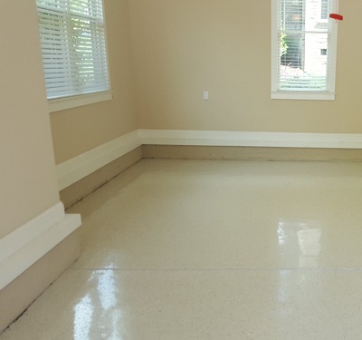 A. The actual work takes four days to complete. On the first day I acid etch the floor. A high RPM rotary floor buffer is used to agitate the acid into the pores of the concrete. The second day is when the two part epoxy primer is applied to the concrete floor. On the second day I will also patch any cracks or gouges or divots in the concrete floor. On the third day I apply the 100% solids epoxy. At that time I broadcast the epoxy flakes into the wet epoxy. This ensures that the flakes are permanently bonded to the epoxy material. On the final day (and once I ensure that the epoxy has sufficiently cured) I apply the clear topcoat.
