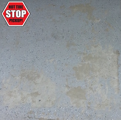 A. NO. Hot tire pickup is a common issue with water based and solvent based epoxies. Remember, these type of epoxies cure at about 2-3 mils thick. The 3 coat system that I apply cures at over 20 mils thick. It is EXTREMELY more durable than other, cheap materials. Hot tire pickup occurs when hot tires soften cheap and thin epoxy coatings. When the tires cool down the tread from the tires contracts causing it to pull the epoxy right off the floor. Typically the store bought kits are only about 30% solids epoxy. I have professionally completed over 100 epoxy floors and haven't had a single floor experience hot tire pickup! That's a pretty good track record, don't you think?