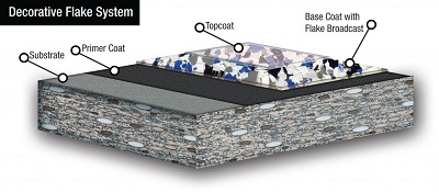 A. Having both epoxy and polyurethane applied to the floor gives your garage floor a complete, superior system that cannot be attained if just one of these components are used without the other. The epoxy component mechanically binds to the pores of the concrete. This acts to permanently bond the system to the concrete substrate. The epoxy alone is extremely durable, but when the polyurethane fortified topcoat is applied over it the end result is a floor system with superior durability, abrasion resistance (resistant to scratching) and stain resistance. Also, without a topcoat over the flakes, the edges of the flakes would collect dirt and grime. But by adding the topcoat it seals the flakes in so that they are permanently protected. This allows the floor to be easily cleaned and the flakes will not dull or become permanently soiled. The polyurethane ensures that your floor will maintain its showroom quality, high gloss finish for years to come.